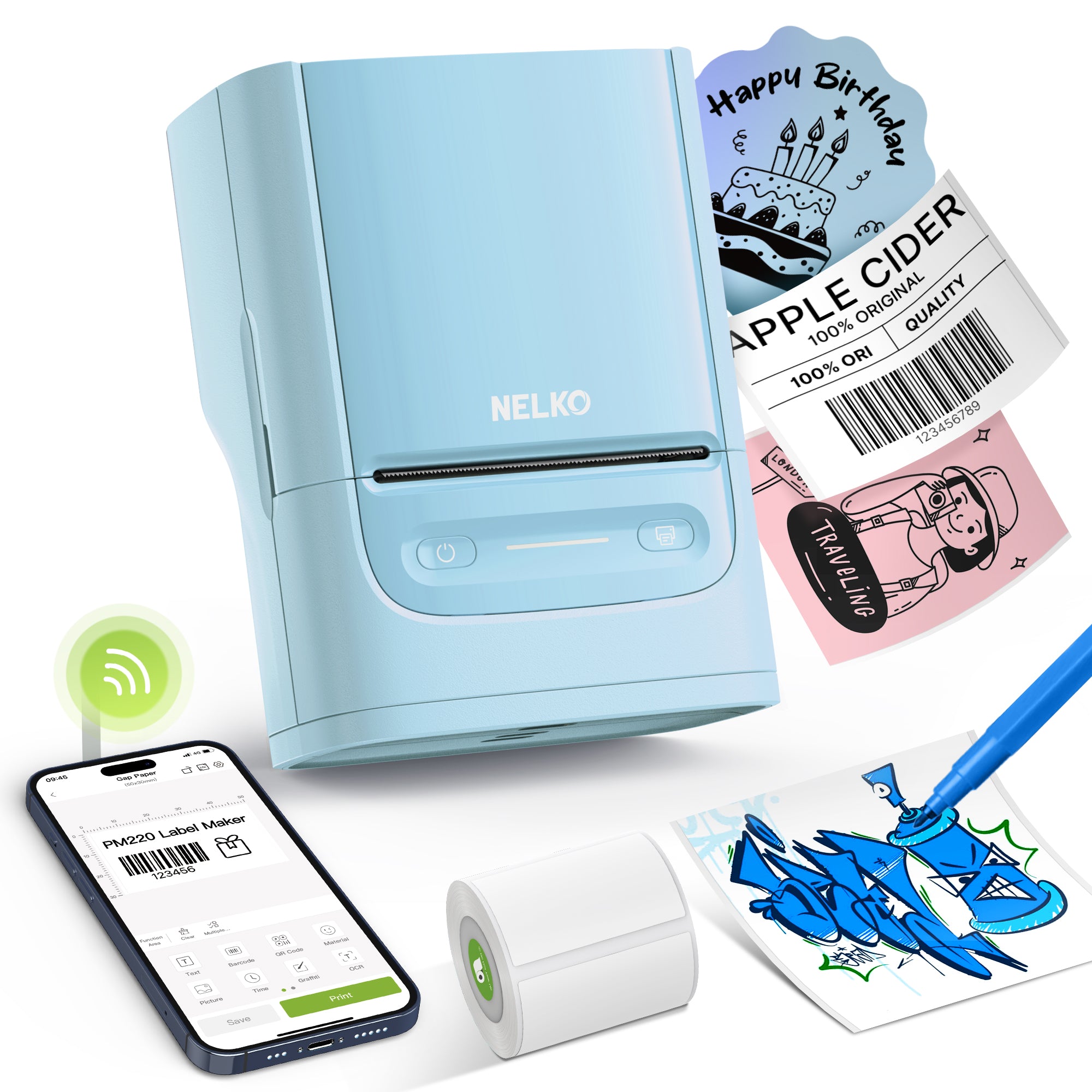 Nelko PM230 Bluetooth Sticker Printer – Portable Mini Sticker Maker with 3 Rolls Paper, Compatible with Phone & Tablet, Multiple Templates, Blue