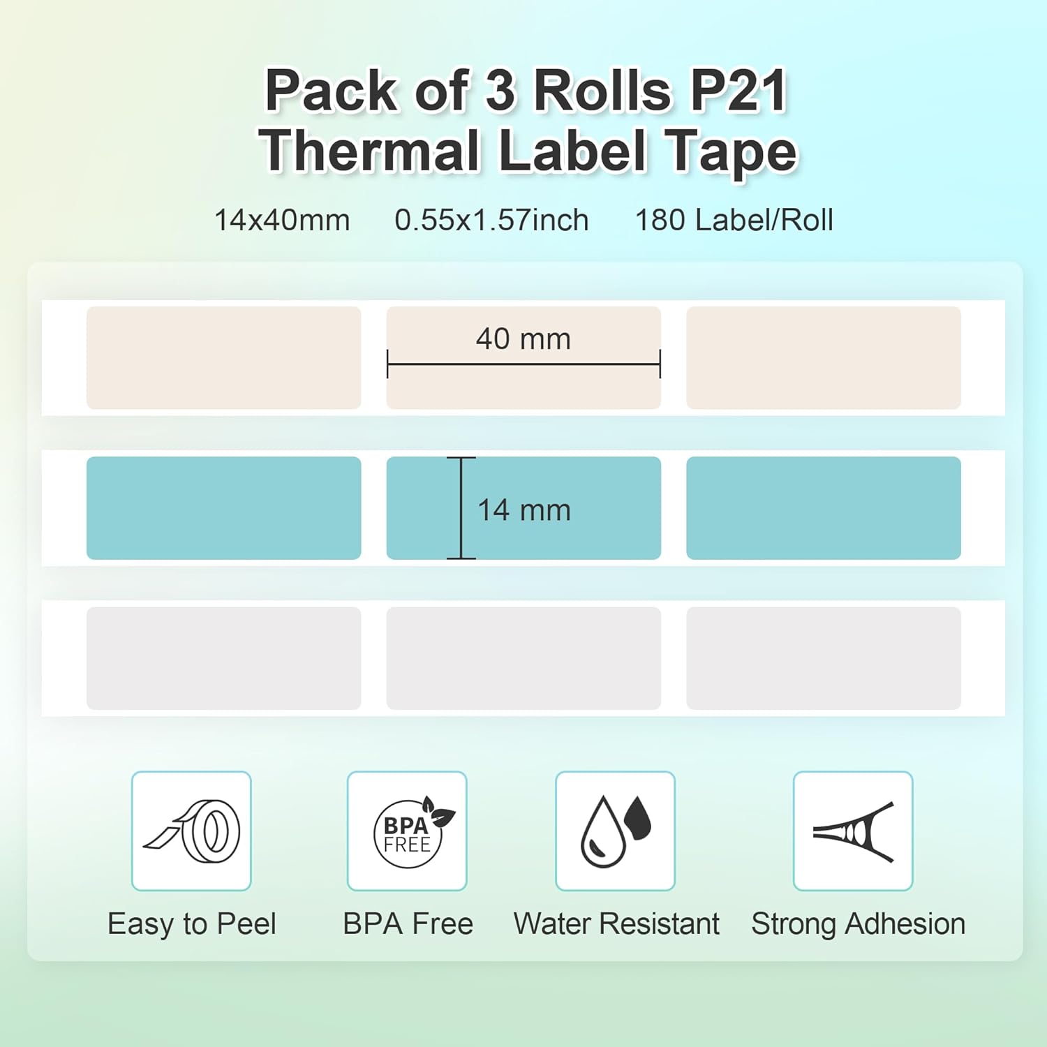【P21 Lable Maker Tape】This thermal label tape is especially suitable for the Nelko P21 printer. There are 3 rolls of label paper in total, with size 14x40mm (0.55"x1.57"), 180 Labels/Roll, 3 Rolls, Grey/Brown/Green. Please do not tear or destroy the green sticker, otherwise it will affect the printing effect.