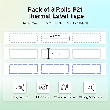 【P21 Lable Maker Tape】This thermal labels tape is specially suitable for Nelko P21 printer. There're 3 rolls label paper in total, with size 14x40mm (0.55"x1.57"), 180 Labels/Roll, 3 Rolls, Purple/Rose/Pink. Please do not tear or destruct the green sticker, otherwise it will affect the printing effect.