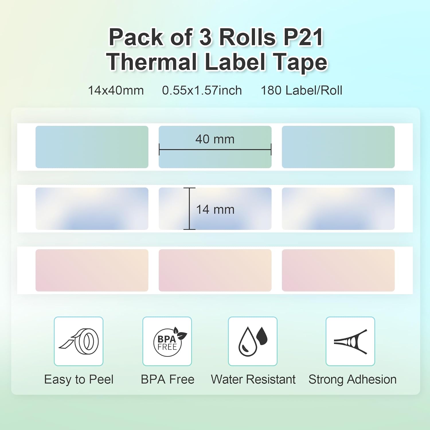 【P21 Lable Maker Tape】This thermal label tape is especially suitable for the Nelko P21 printer. There're 3 rolls of label paper in total, with size 14x40mm (0.55"x1.57"), 180 Labels/Roll, 3 Rolls, Gradient Pink/Blue/Green. Please do not tear or destroy the green sticker, otherwise it will affect the printing effect.