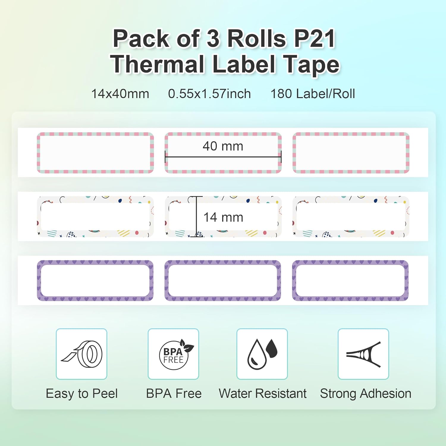 NELKO Genuine P21 Label Maker Tape, Adapted Label Print Paper, 14x40mm (0.55"x1.57"), Gradient Pink Blue Green Standard Laminated Labeling Replacement, Multipurpose of P21, 180 Tapes/Roll, 3-Roll, Pattern with Border 2.0