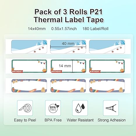 【P21 Lable Maker Tape】This thermal labels tape is specially suitable for the Nelko P21 printer. There're 3 rolls of label paper in total, with size 14x40mm (0.55"x1.57"), 180 Labels/Roll, 3 Rolls, Birthday Theme. Please do not tear or destruct the green sticker, otherwise it will affect the printing effect.