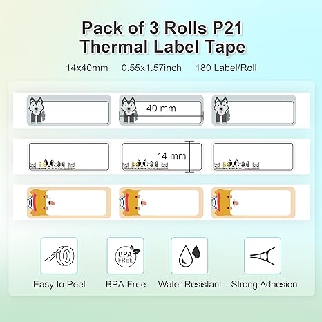 【P21 Lable Maker Tape】This thermal label tape is especially suitable for Nelko P21 printer. There're 3 rolls of label paper in total, with size 14x40mm (0.55"x1.57"), 180 Labels/Roll, 3 Rolls, Cute Theme. Please do not tear or destruct the green sticker, otherwise it will affect the printing effect.