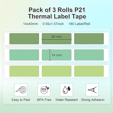 【P21 Lable Maker Tape】This thermal label tape is especially suitable for Nelko P21 printer. There are 3 rolls of label paper in total, with size 14x40mm (0.55"x1.57"), 180 Labels/Roll, 3 Rolls, Light Green/Green/Dark Green. Please do not tear or destroy the green sticker, otherwise it will affect the printing effect.
