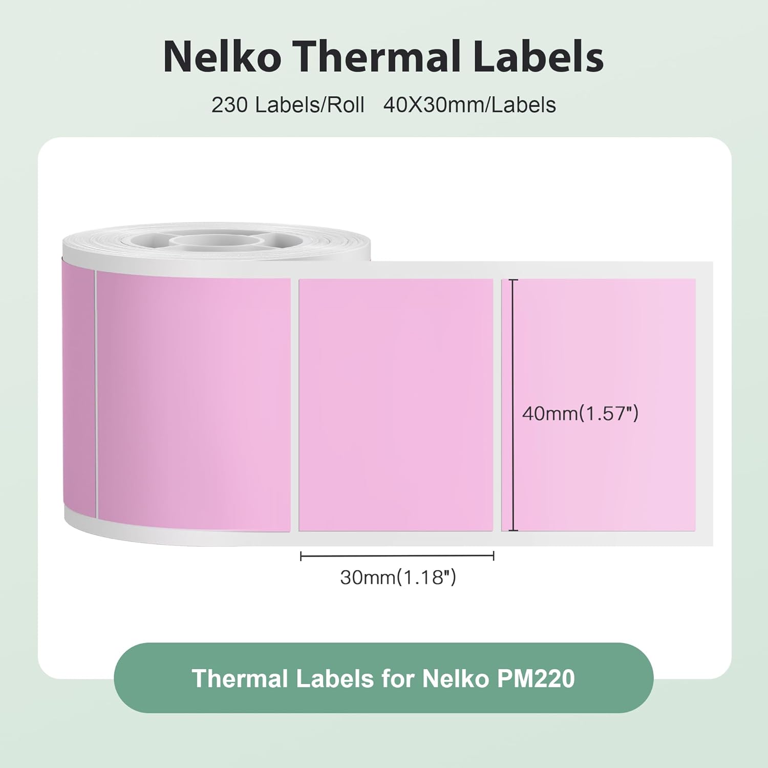 - Specifications- Label Size: 1.57"x1.18" (40x30mm). Quantity: 1 Rolls, 230 labels. Color: Pink. Genuine thermal label tape compatible with Nelko PM220 label maker, it may not work on other label makers