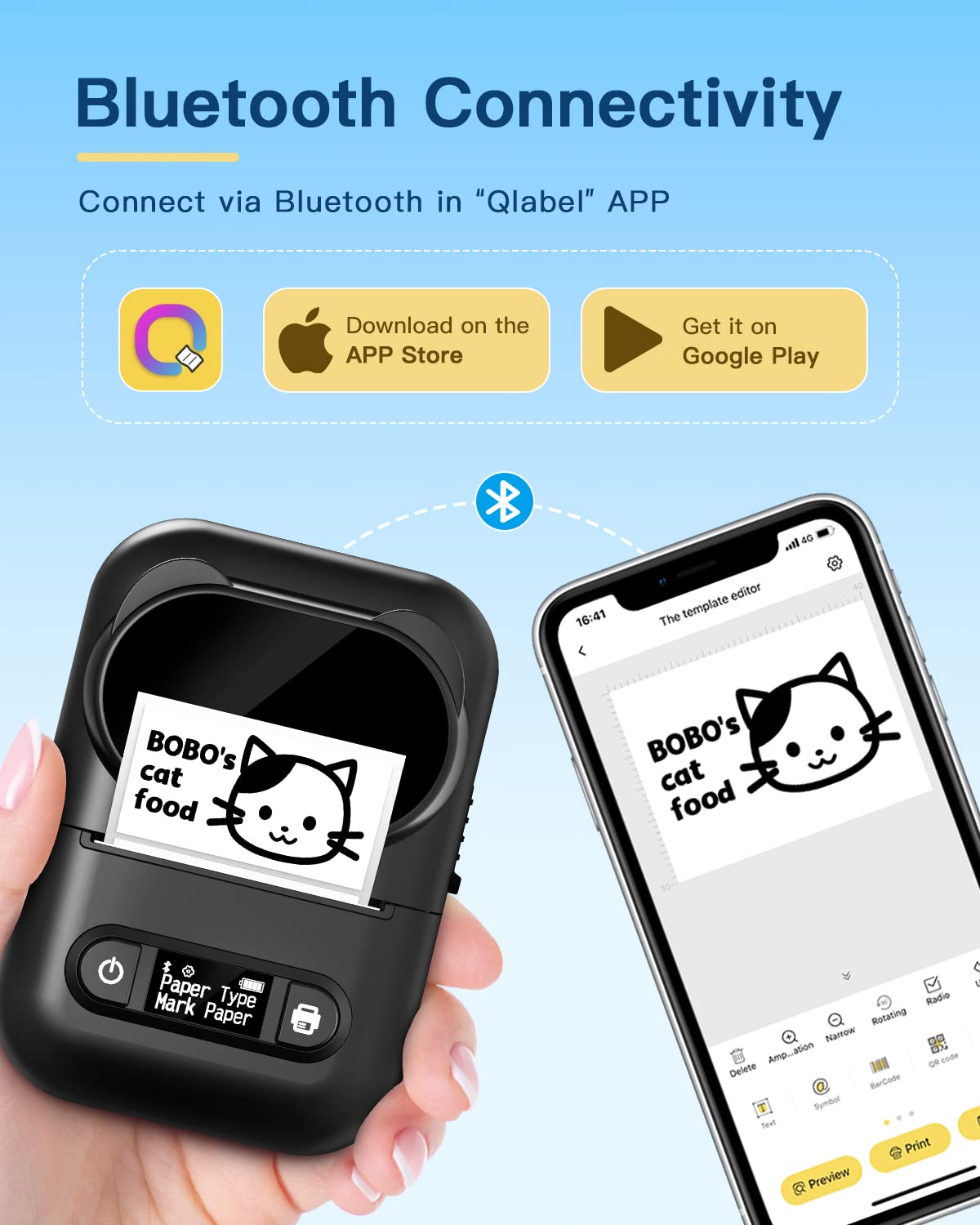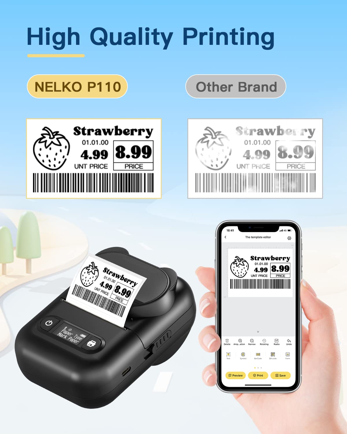 • 【Easy to Use】NELKO Mini Portable Bluetooth Wireless thermal mobile label maker, connect your iOS & Android mobile phone easily. Step 1: Download "Qlabel" APP from Google Play or App Store. Step 2: Install the paper roll. Step 3: Connect the P110 label maker bluetooth within APP. Step 4: Choose a quick template and start enjoying one click printing. There are a lot of templates in barcode label maker APP, you can easily print you need.