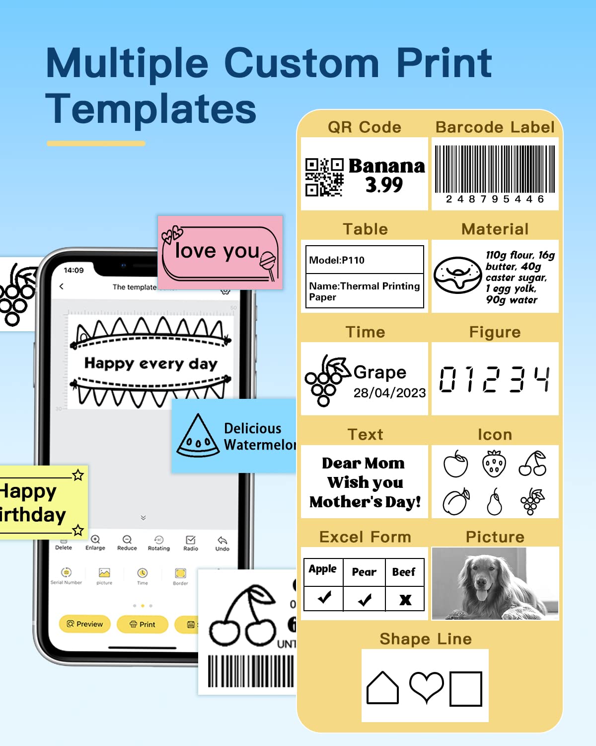 【Powerful APP】P110 Bluetooth label maker machine with free label templates and can set up your own templates. You can edit and typeset labels, supporting QR Code, Barcode Label, Table, Material, Time, Figure, Text, Icon, Excel Form, Picture, Shape Line. NELKO "Qlabel" APP with 20+ fonts, 300+ emojis, 200+ materials are provided for custom label designs. Label makers increase your productivity and efficiency.