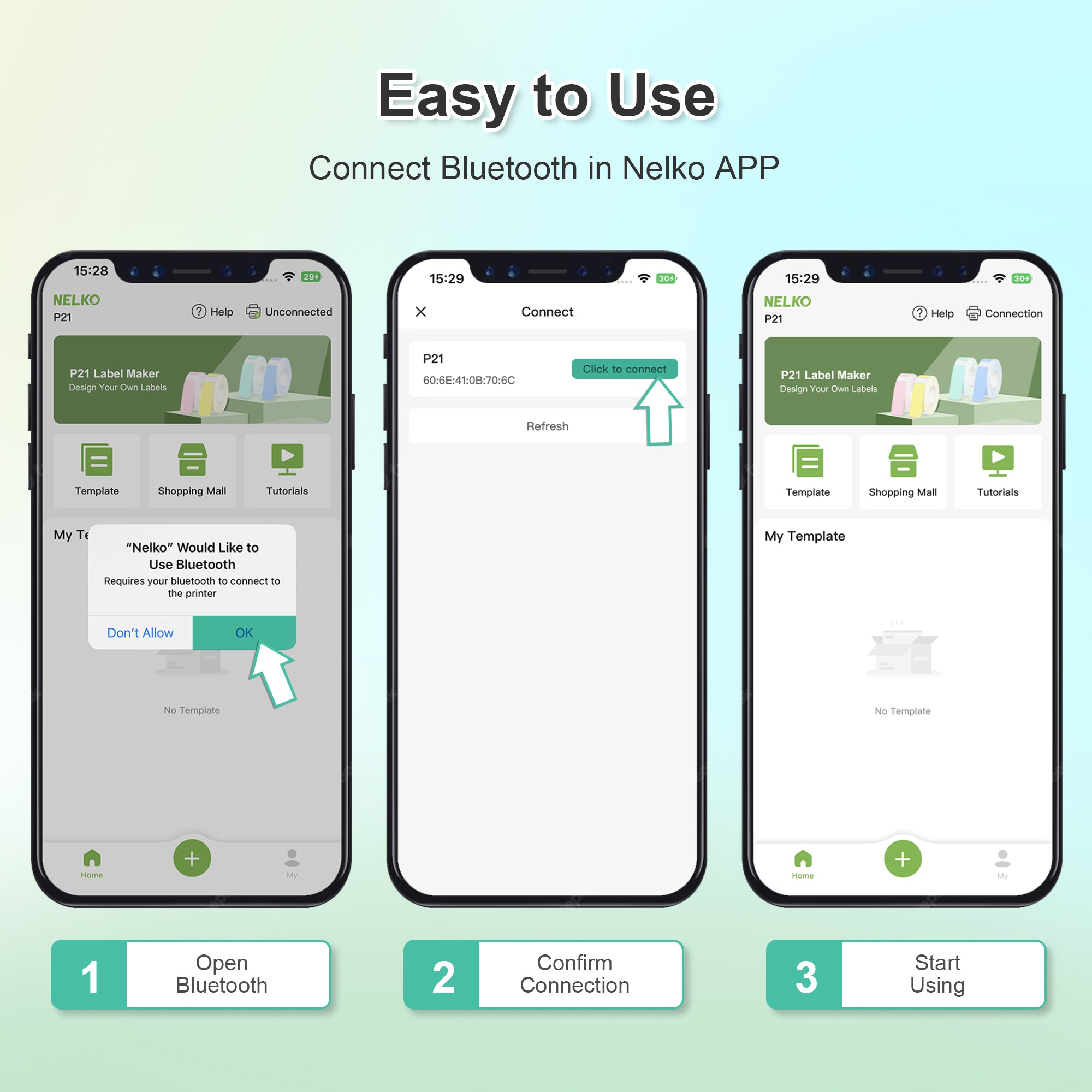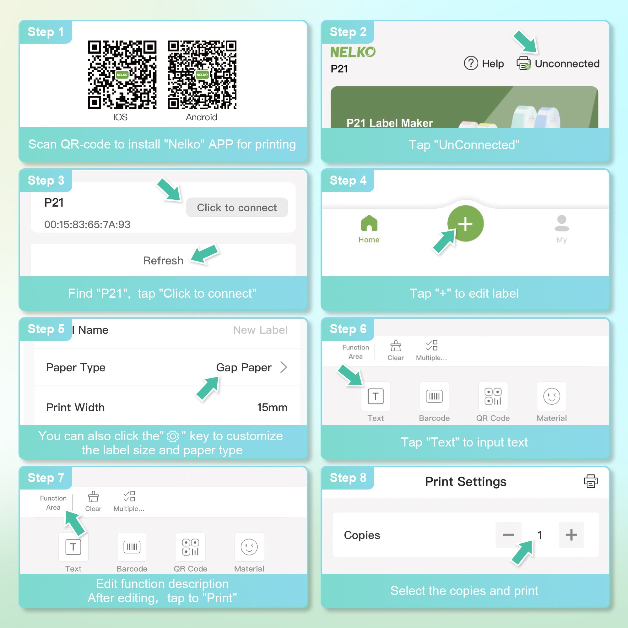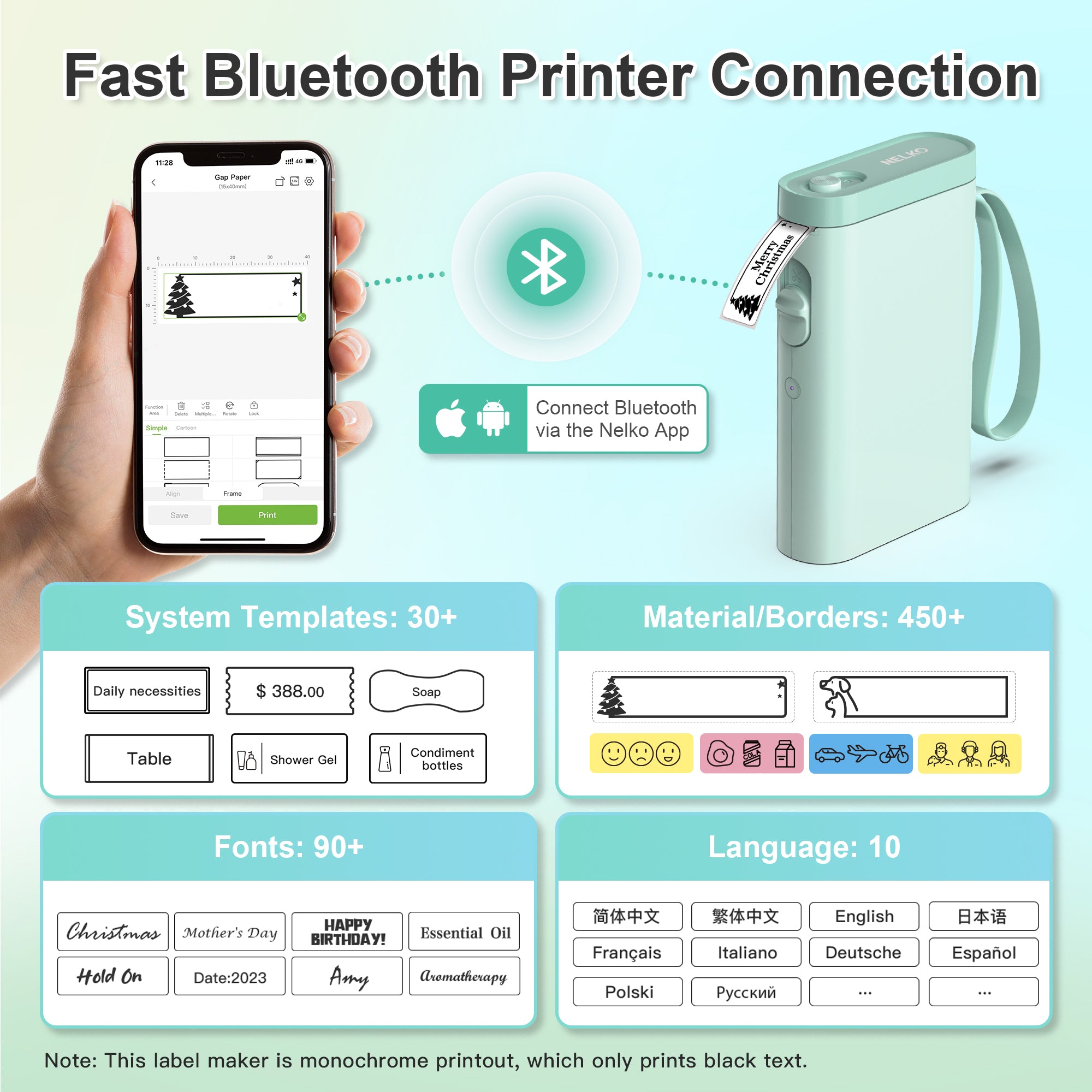 - ✅【Easy to Use】NELKO label printer compatible with IOS & Android Phone via bluetooth connection. Step 1: Download "Nelko" APP from Google Play or App Store. Step 2: Install the paper roll. Step 3: Connect the P21 bluetooth within APP. Step 4: Choose a quick template and start printing. This label maker machine with tape APP included more than 90 +Fonts, 10+ Languages, 450+ Materials. (Note: This label maker doesn't work with computers)