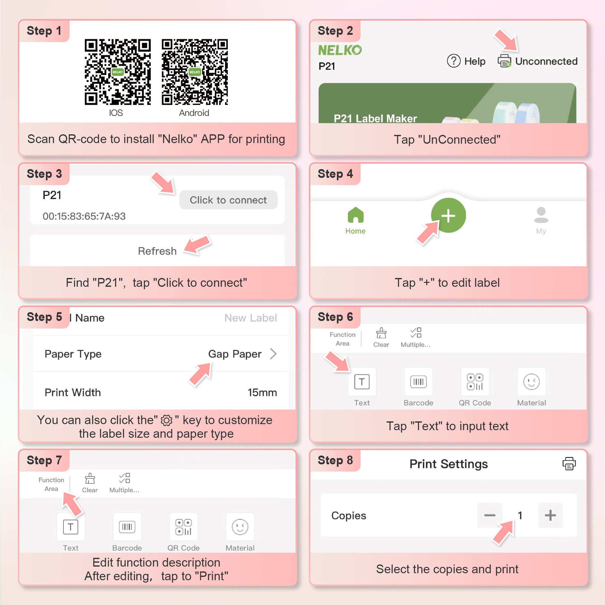 - ✅【Easy to Use】NELKO label printer compatible with IOS & Android Phone via bluetooth connection. Step 1: Download "Nelko" APP from Google Play or App Store. Step 2: Install the paper roll. Step 3: Connect the P21 bluetooth within APP. Step 4: Choose a quick template and start printing. This label maker machine with tape APP included more than 90 +Fonts, 10+ Languages, 450+ Materials. (Note: This label maker doesn't work with computers)