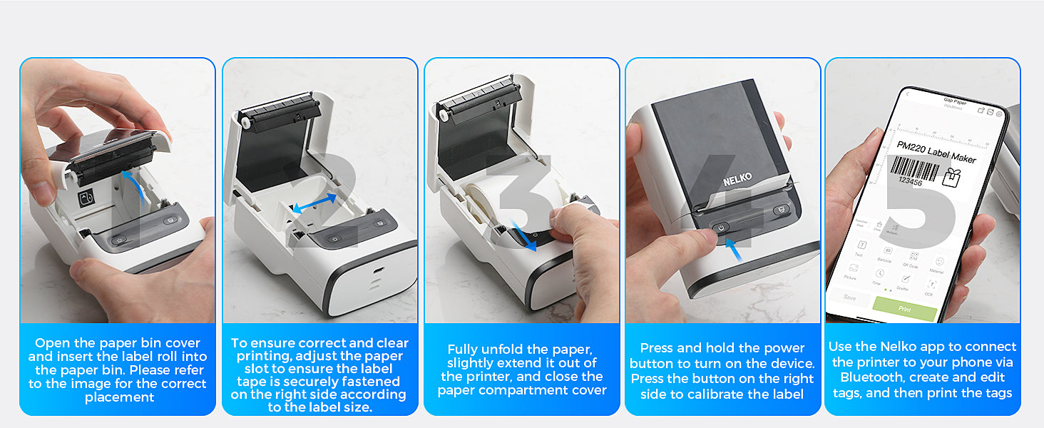 • 【High-quality Printing】Nelko Label Makers with BPA-Free Direct Thermal Technology. Equipped with high-speed chips and 203 DPI, you can enjoy high-definition without relying on ink or toner. Nelko Bluethooth Label Makers support label width 23-54mm(0.91"-2.12"), including 40x30mm, 50x50mm, 50x30mm, 50x80mm. The Label maker comes with a 50x30mm Label Tape placed in the paper bin. We recommend using our NELKO PM220 Label Maker Tape for better printing quality.