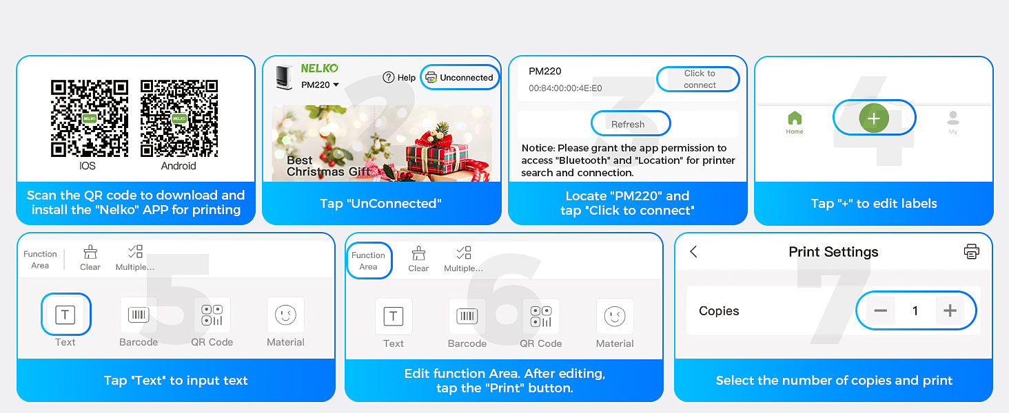 • 【Easy to Use】PM220 Bluetooth Label Makers supports iOS & Android and PC. For iOS & Android mobile phone, please download the "Nelko" APP to Print via Bluethooth. For PC, please visit " nelkoprint.com" to obtain the PM220 computer driver and related installation tutorials. Notice: Please DO NOT connect directly via Bluetooth for all devices.