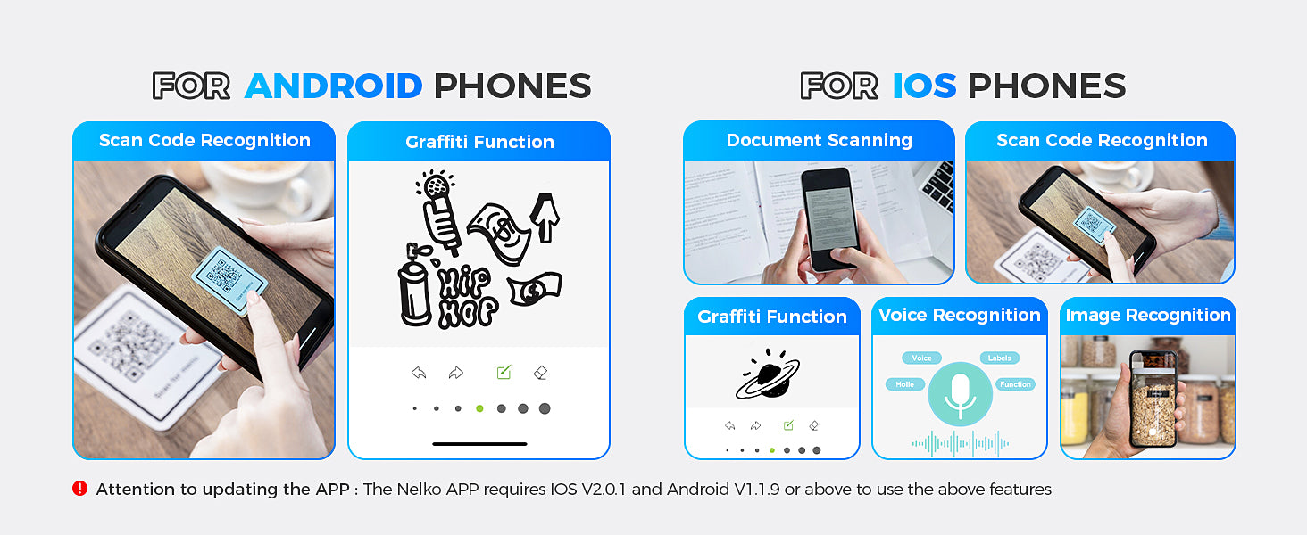supports iOS, Android, and PC. Use the "Nelko" app for mobile devices or download the Nelko driver for PC.
