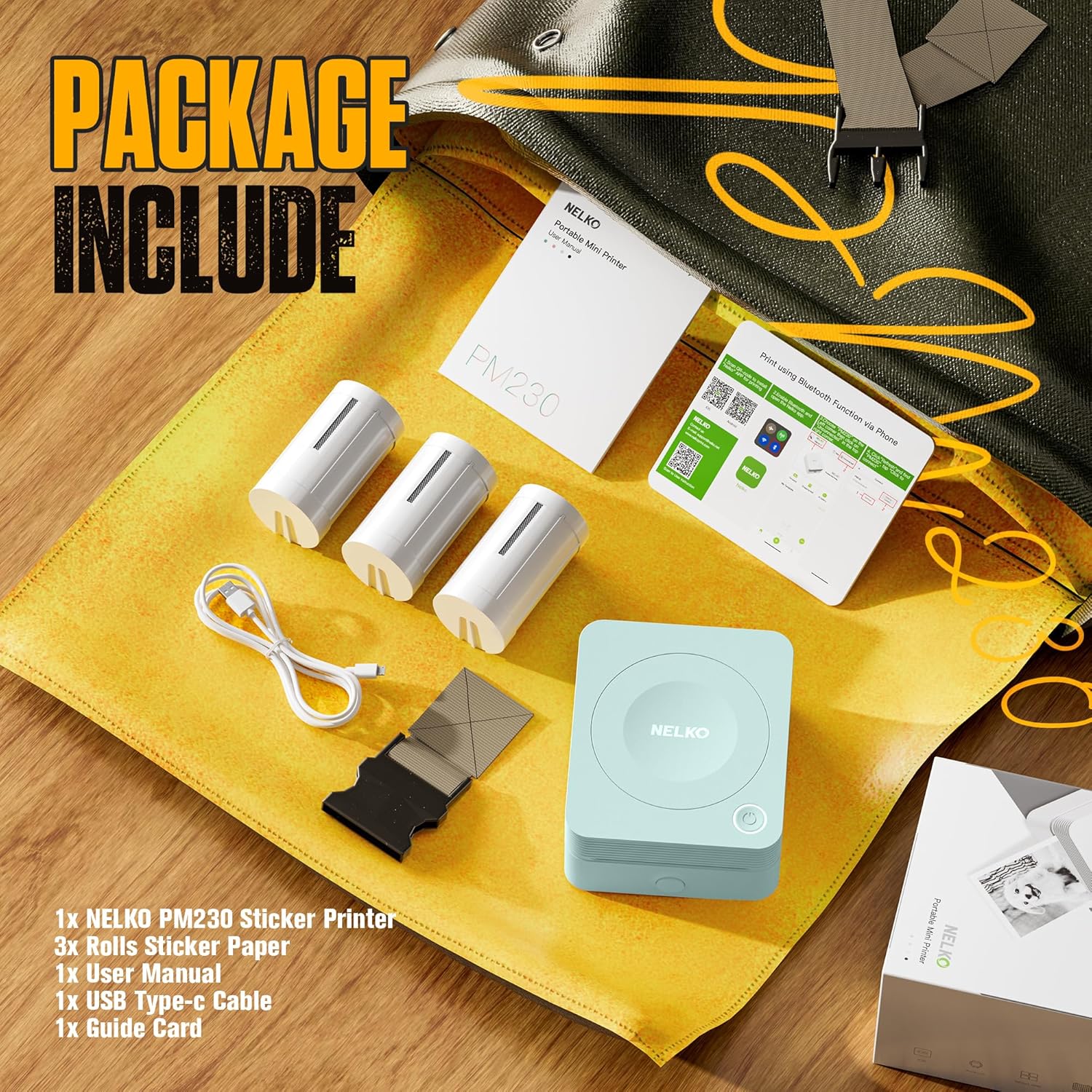 Nelko PM230 Bluetooth Sticker Printer – Portable Mini Sticker Maker with 3 Rolls Paper, Compatible with Phone & Tablet, Multiple Templates, Green